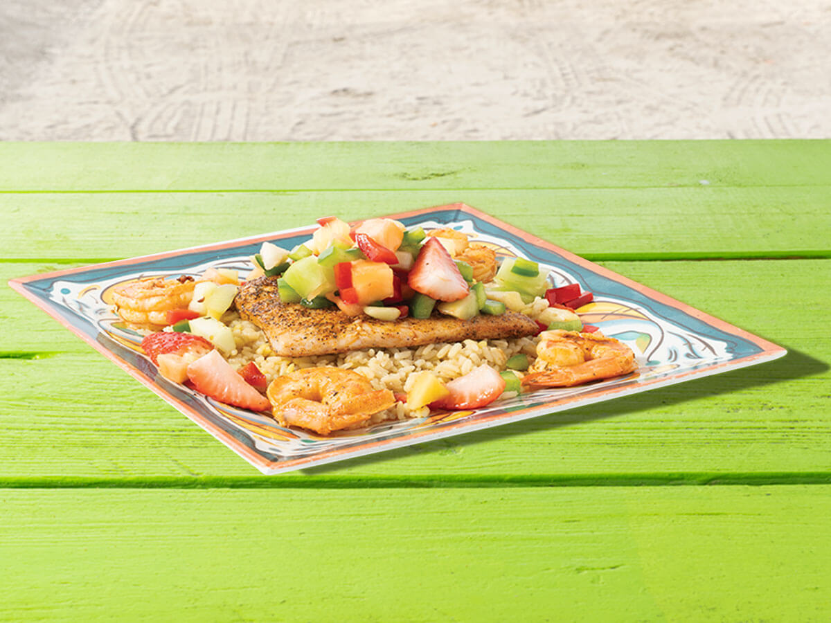 Over rice pilaf with a fresh fruit salsa and 4 large blackened shrimp $29